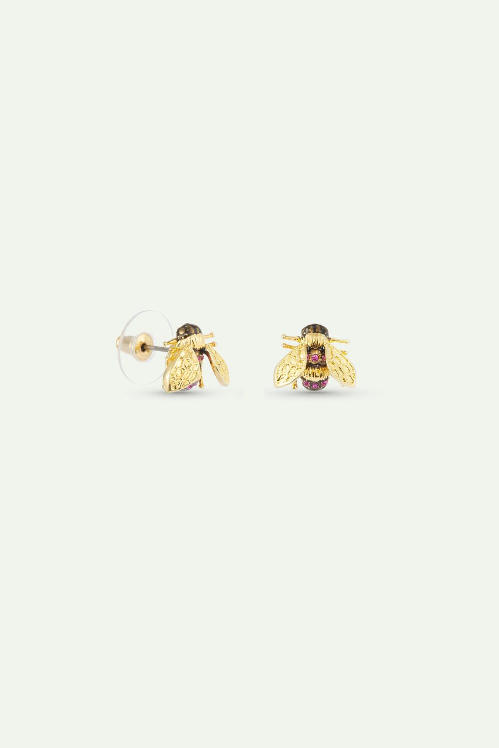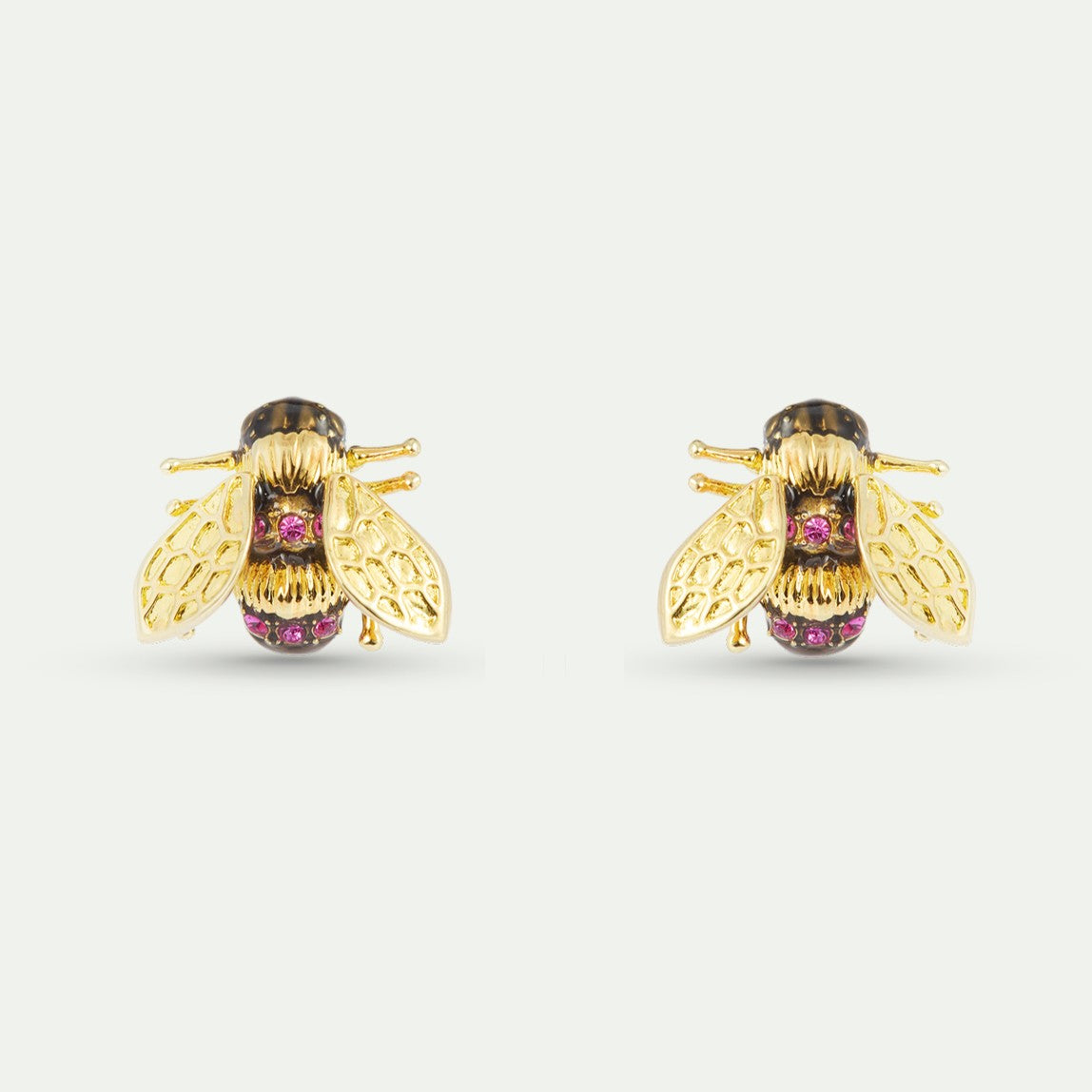 Gold-plated brass bee earrings with textured wings resembling a honeycomb, adorned with pink cubic zirconia stones.