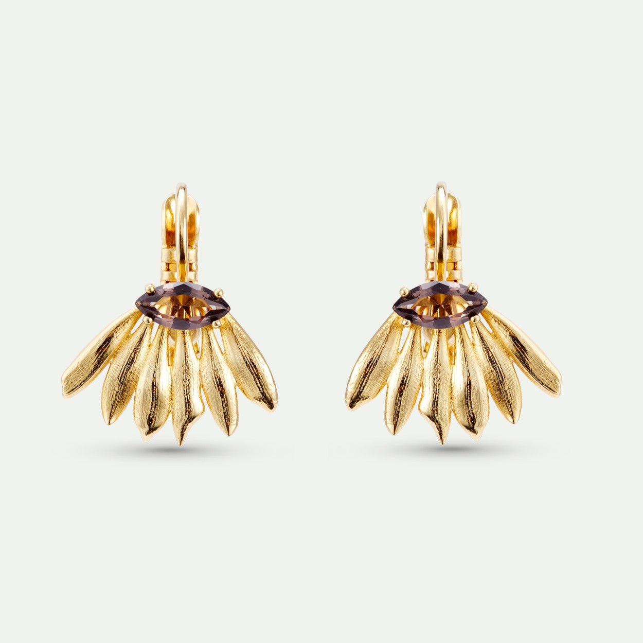 Gold-plated brass sunflower sleeper earrings , fan-shaped petals and plum-coloured cubic zirconia stone with marquise cut.