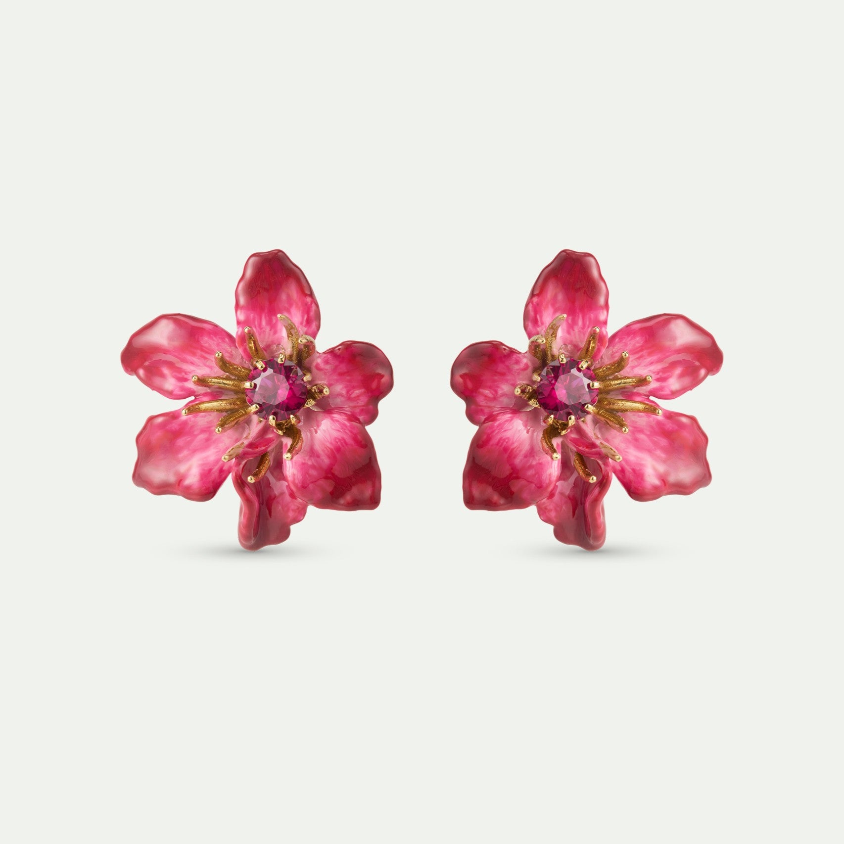 Large pink hand-enamelled clematis post earrings, faceted glass, gold-plated brass.