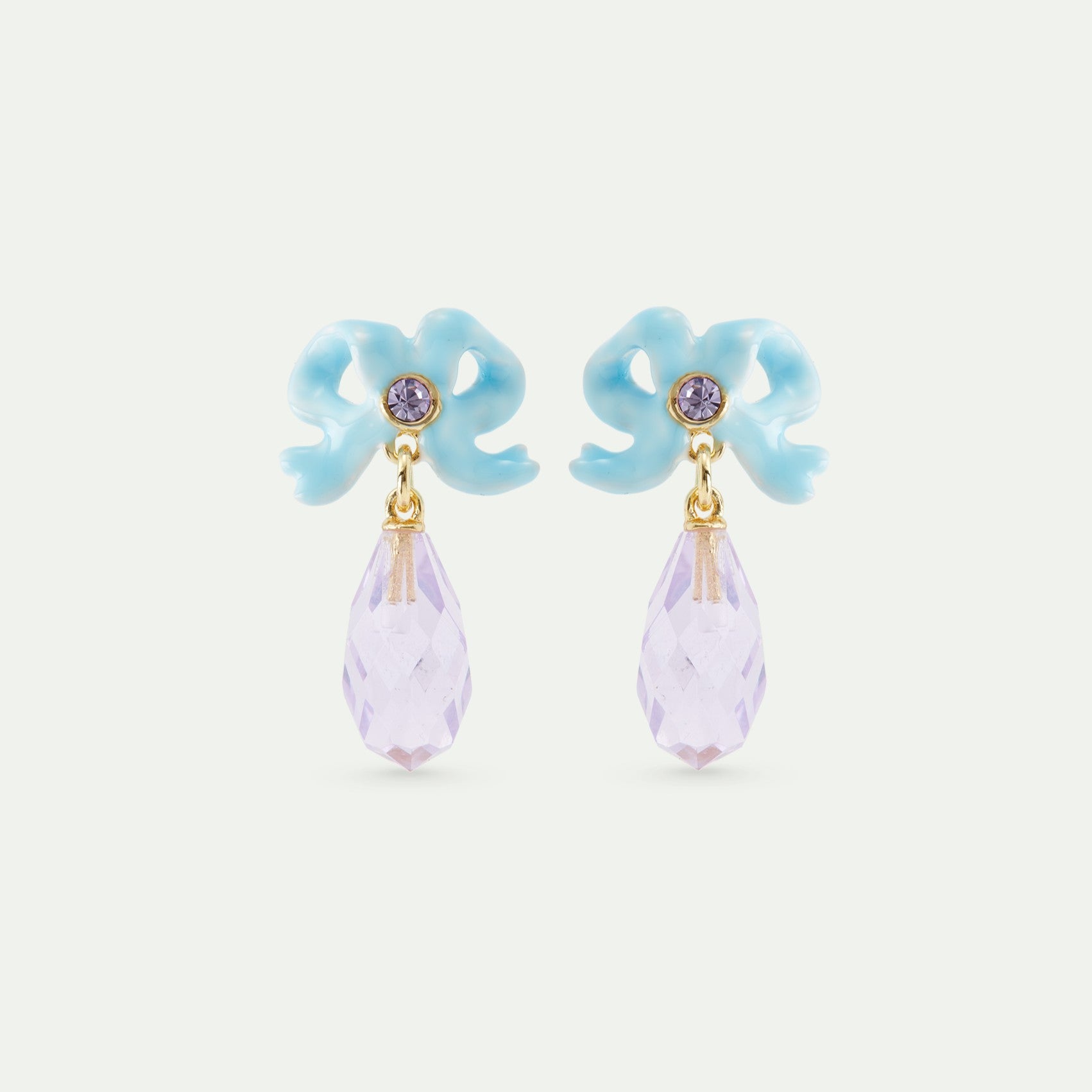 See-through lavender-purple stone earrings, faceted pear-cut glass, hand-enamelled sky-blue ribbon adorned with a purple crystal.
