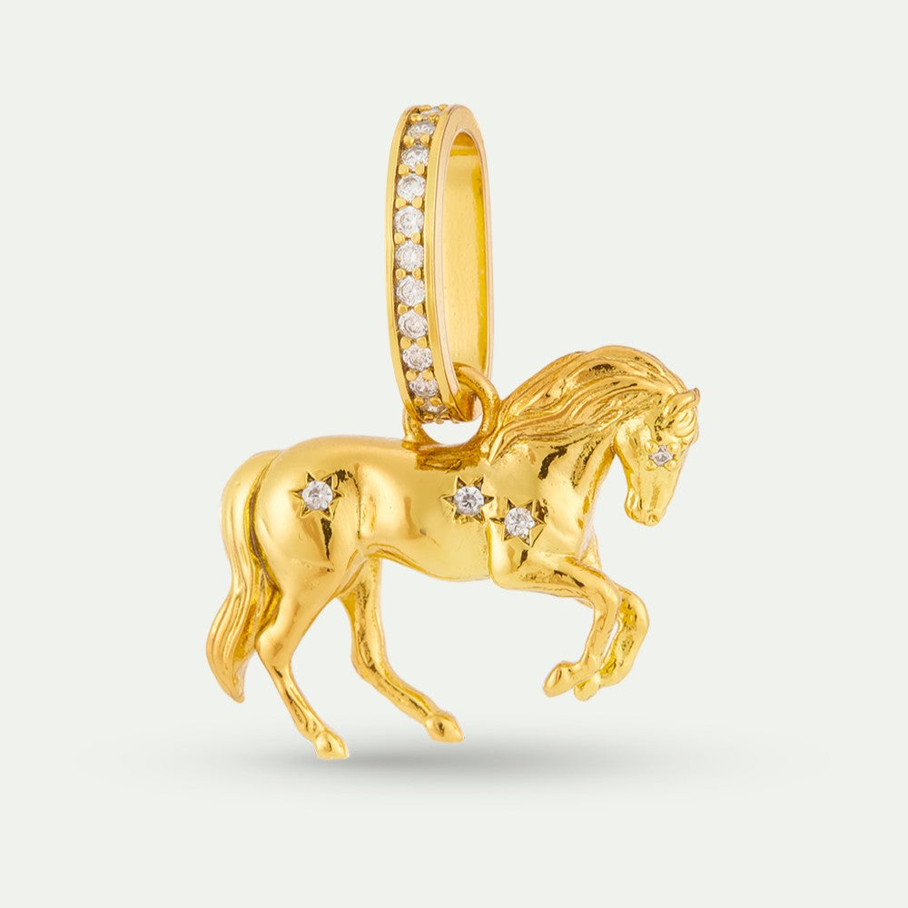Gold-plated brass horse pendant, bail adorned with cubic zirconia